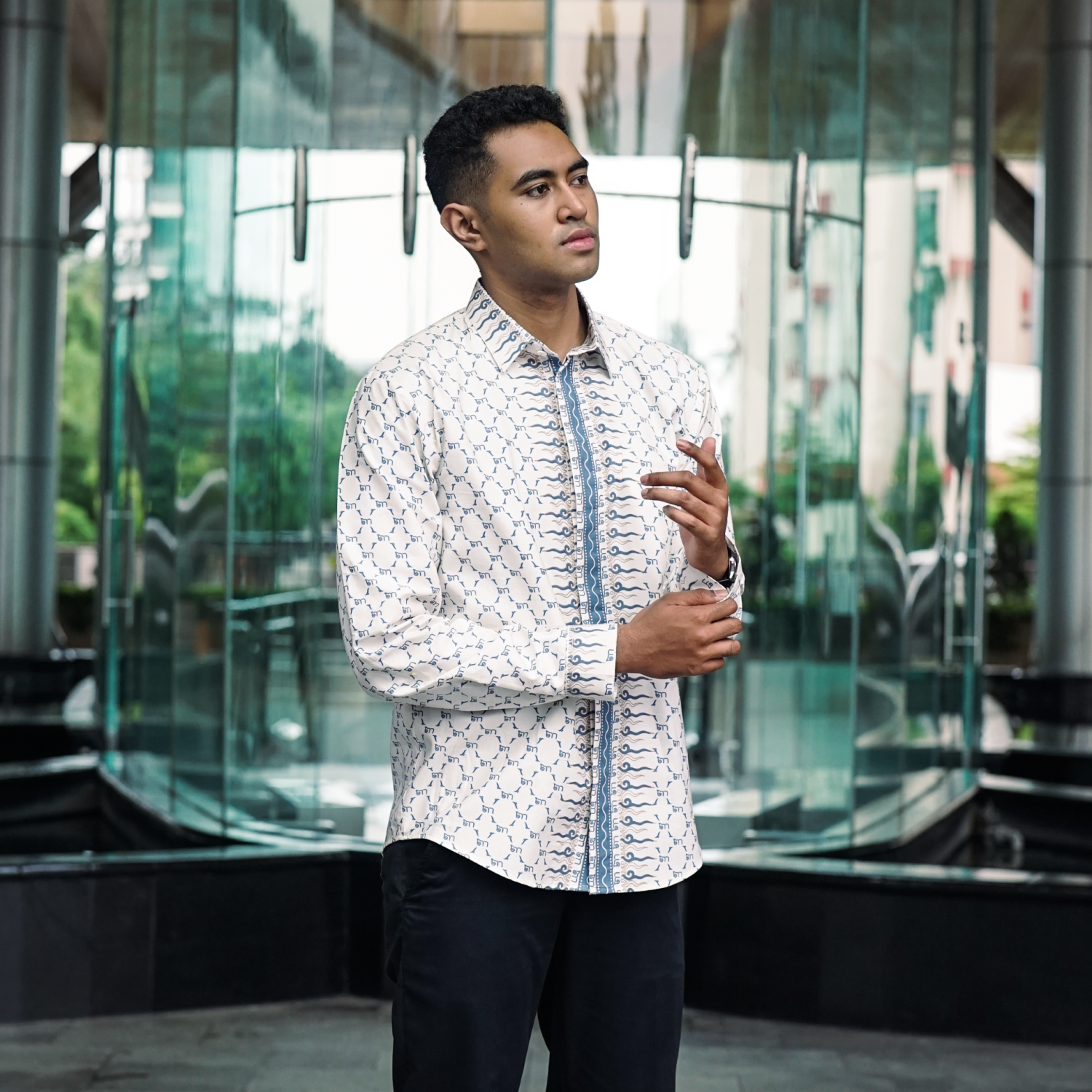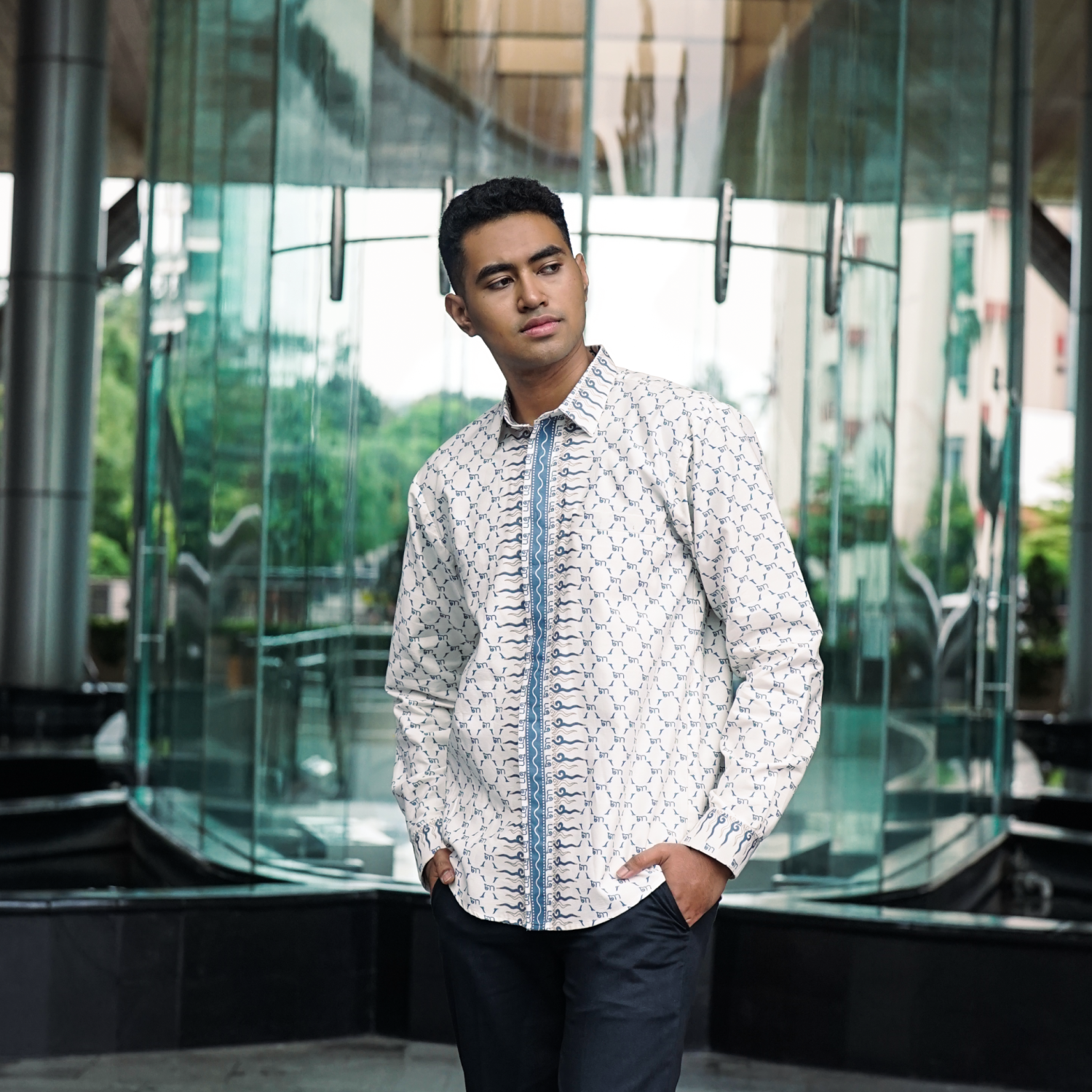 Didesain dengan cutting slim fit yang mengikuti bentuk tubuh, kemeja ini memberikan siluet yang rapi dan modern. Detail motif yang subtle menjadikannya pilihan tepat bagi Anda yang menyukai gaya minimalis tanpa mengurangi kesan elegan, cocok digunakan untuk acara formal maupun semi-formal.