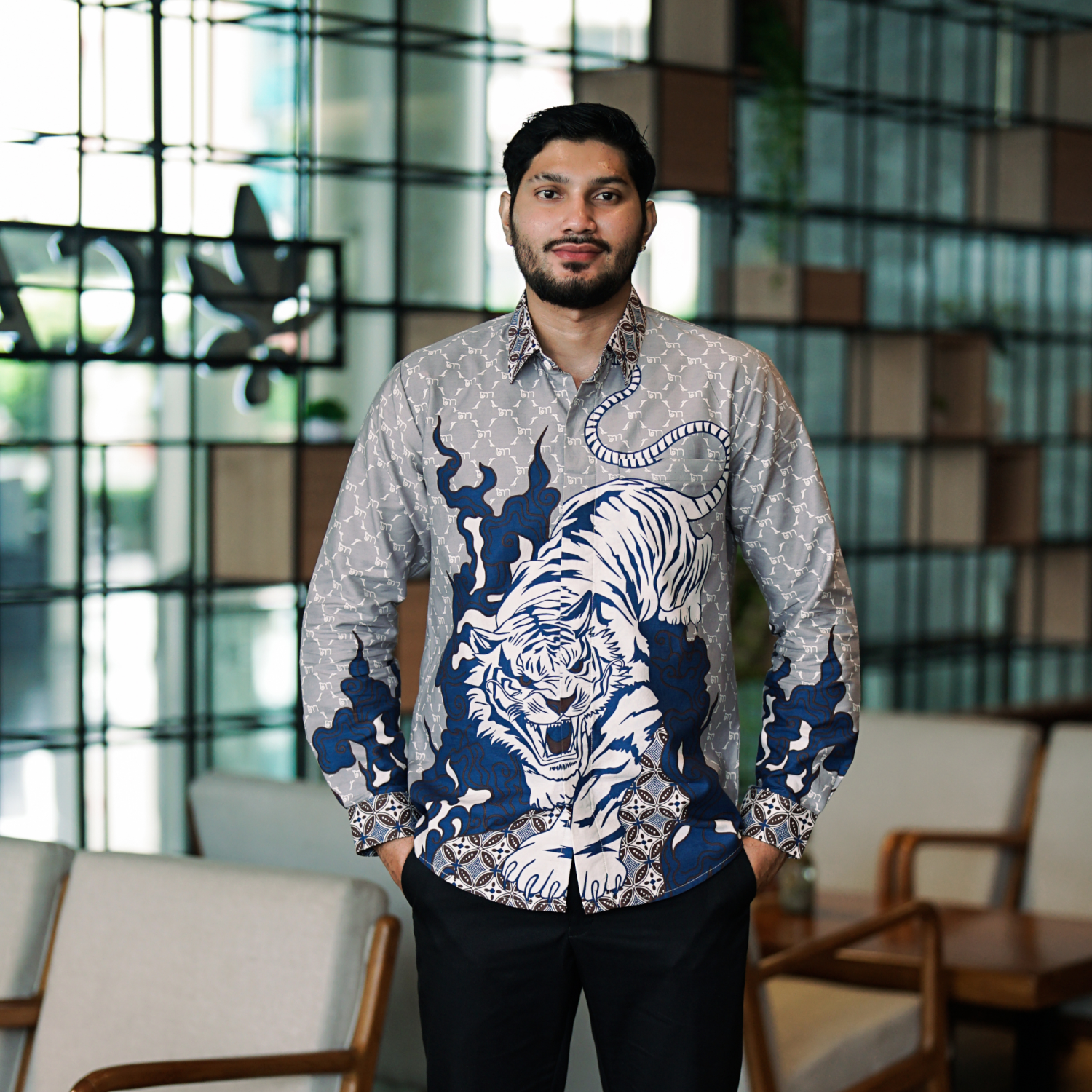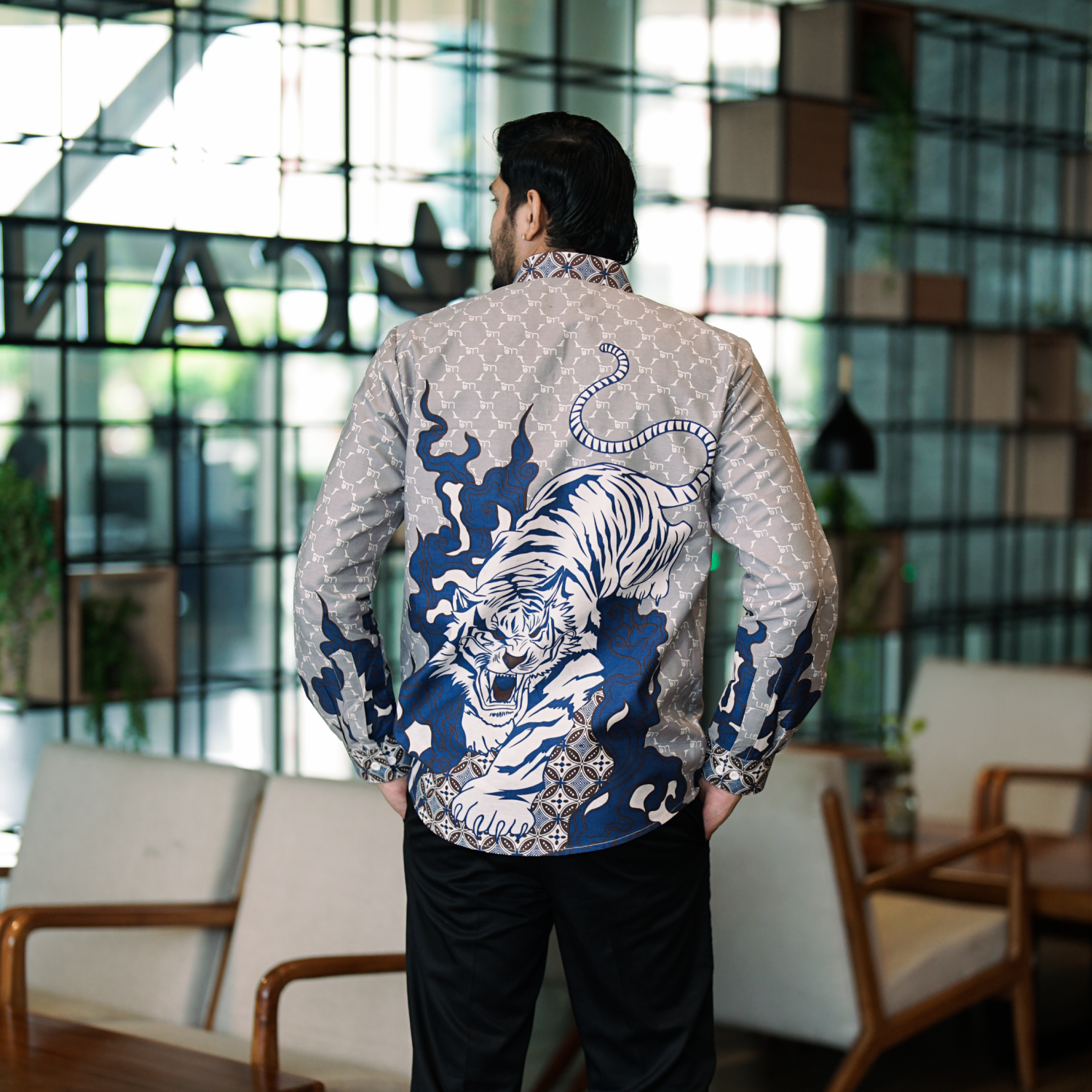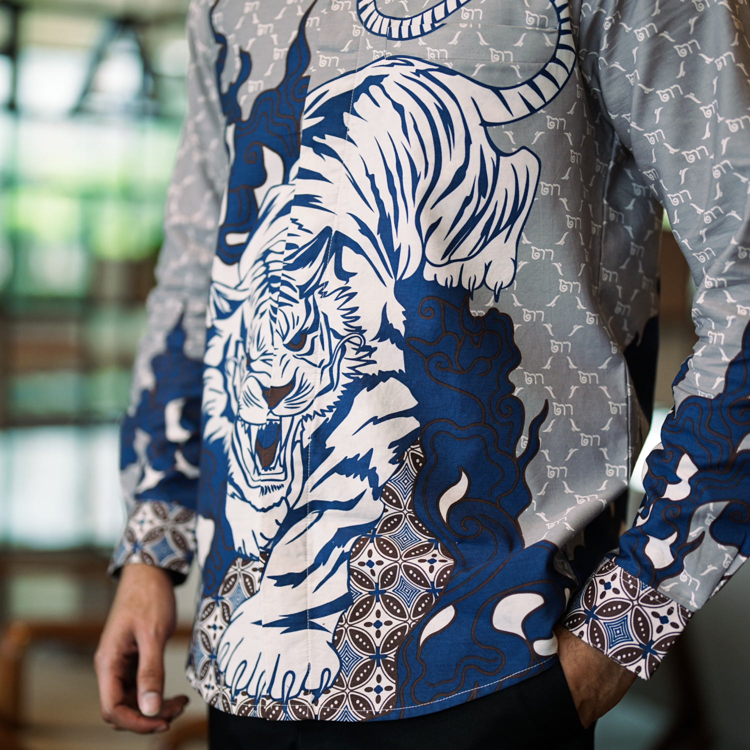 Desain slim fit memberikan potongan yang pas di badan, menonjolkan siluet yang rapi dan modern. Motif tiger yang dominan dipadukan dengan ornamen khas batik menghadirkan sentuhan etnik kontemporer yang unik, cocok untuk Anda yang ingin tampil standout di acara formal maupun semi-formal.